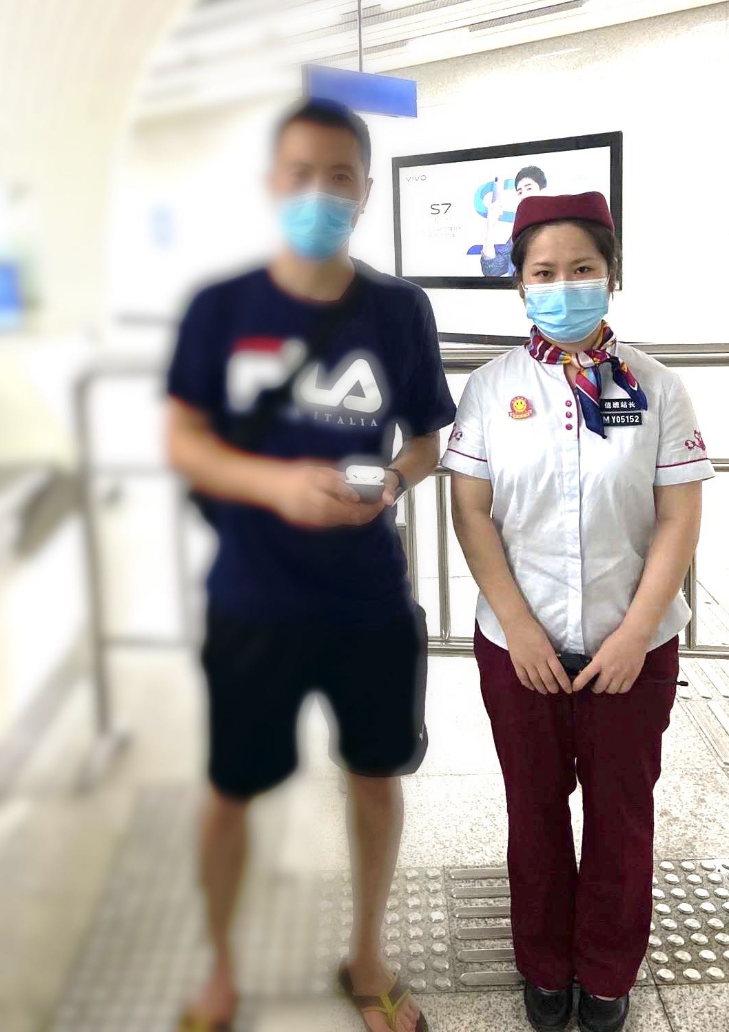 刘先生(左)找到耳机,非常感谢值班站长聂珊珊(右)。刘先生供图