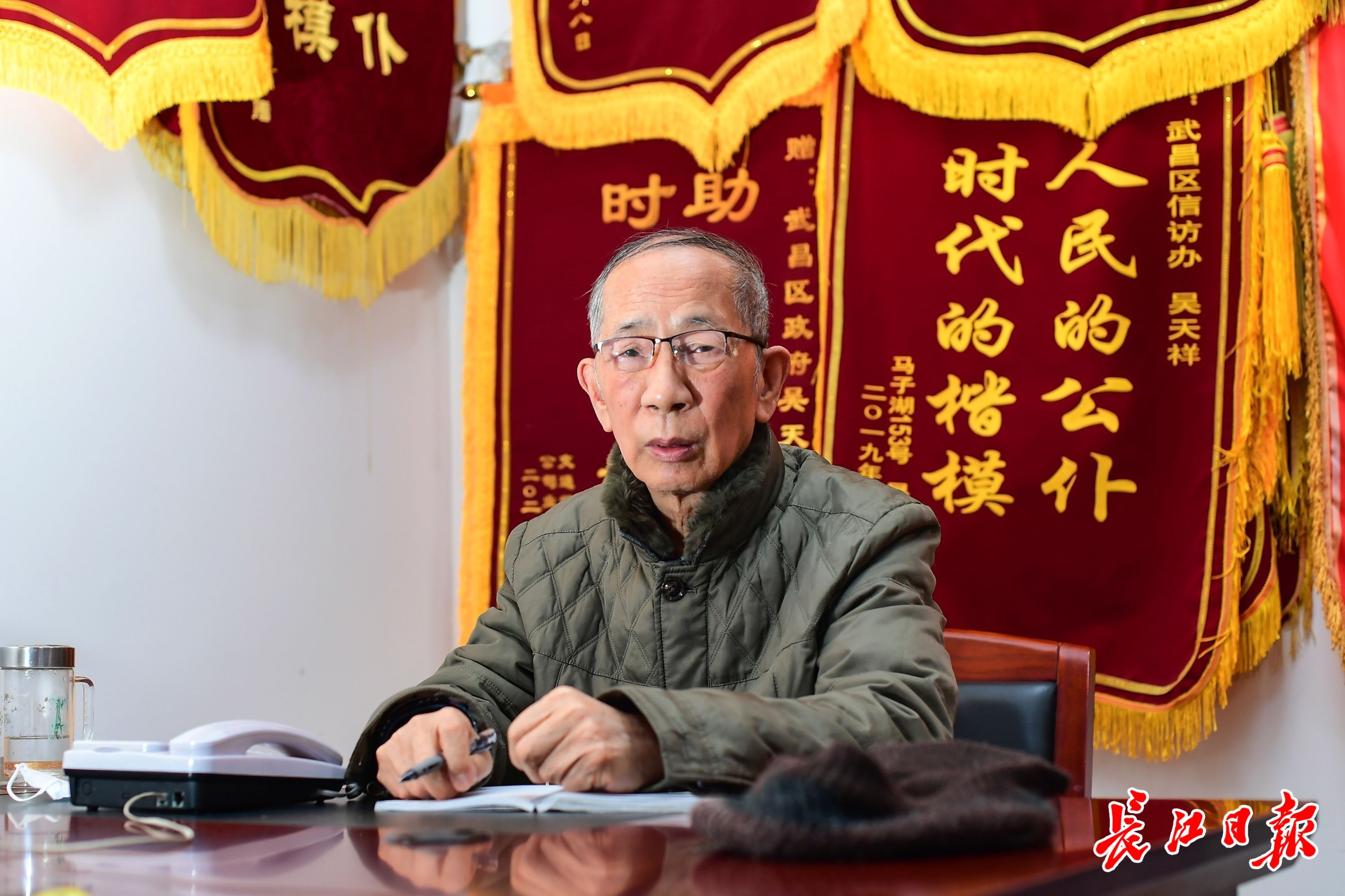 在挂满了群众送来的锦旗的办公室,吴天祥正在记录群众反映的问题。 记者史伟 摄