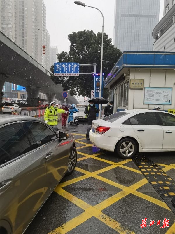 8时,零越下越大,路面车辆逐渐多了起来,此时省妇幼东门入口处进医院的车流和路面车流开始交汇,行进较慢。执勤民辅警看到此情况后,立即赶到入口处进行疏导。