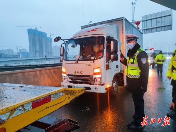 7时35分许,在杨泗港快速通道往白沙洲高架匝道口附近,巡逻交警发现一辆轻型厢式货车停在路边,桥上车辆纷纷避让。交警立即上前询问情况,疏导交通。货车驾驶员告诉记者,他是为附近配送货物人员,早上出门时货车报警系统提示有故障,但重启后就消失了,他以为没事就出发了,谁知半路熄了火。