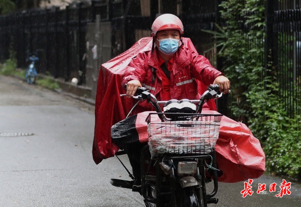 张昊冒雨送快递。 记者何晓刚 摄