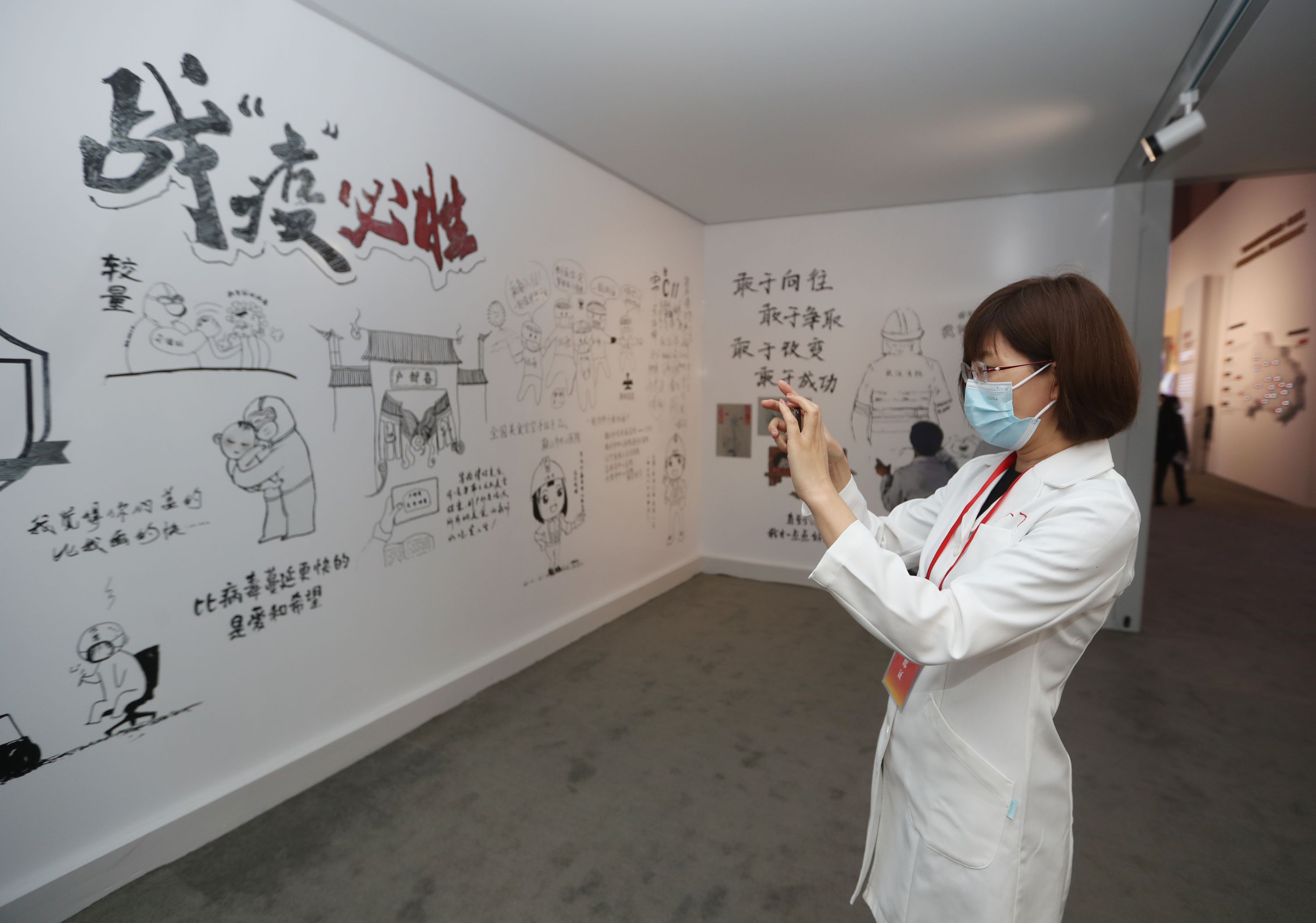 大连医科大学附属第一医院呼吸与危重症医学科医生李艳霞在漫画墙前驻足拍照。 记者何晓刚 摄