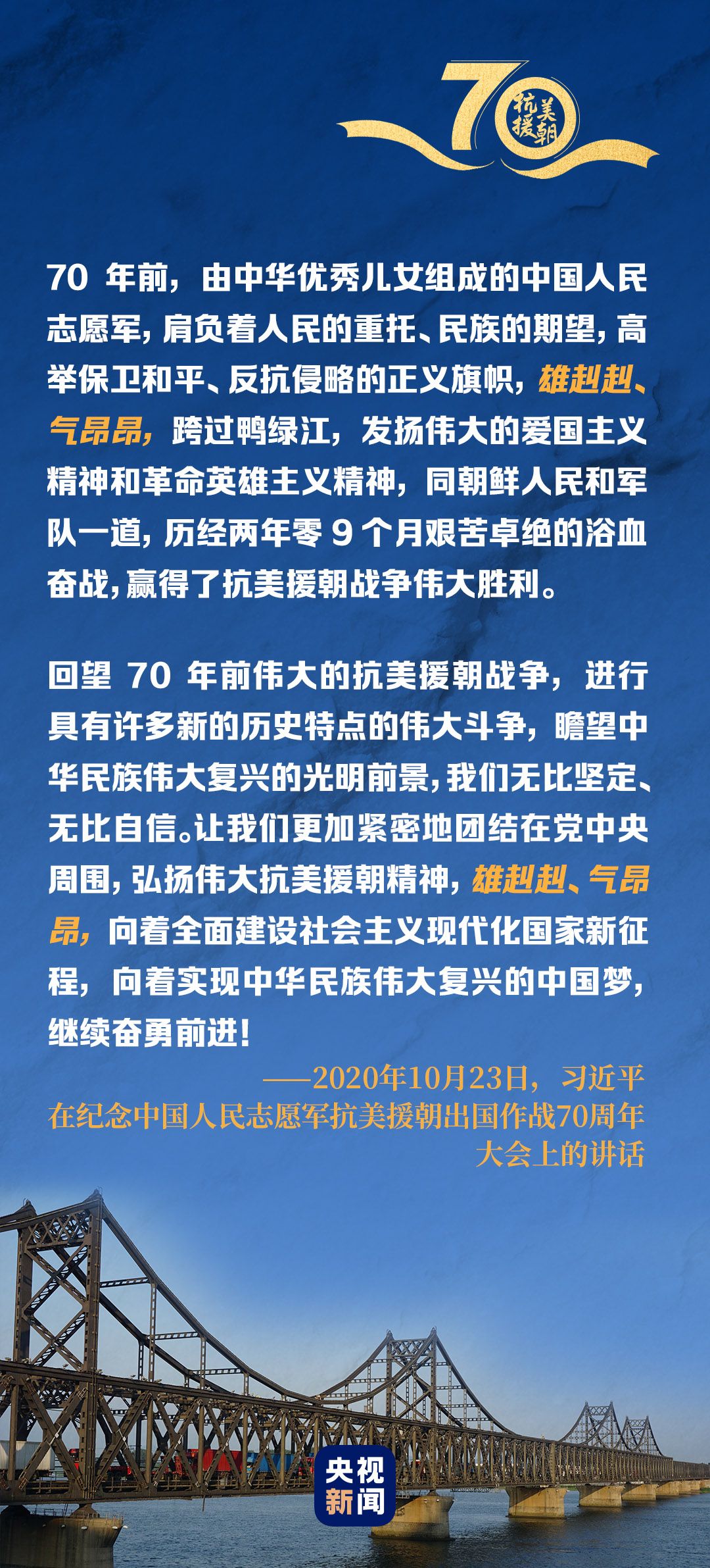10月23日,习近平总书记在纪念中国人民志愿军抗美援朝出国作战70周年大会上的重要讲话中,两次提到“雄赳赳、气昂昂”。