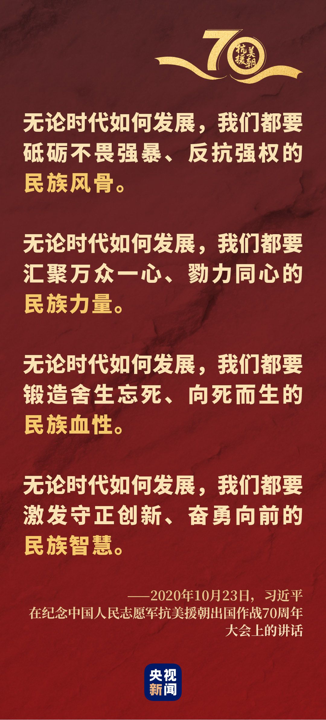“伟大抗美援朝精神跨越时空、历久弥新,必须永续传承、世代发扬。”10月23日,在纪念中国人民志愿军抗美援朝出国作战70周年大会上,习近平这样阐述。