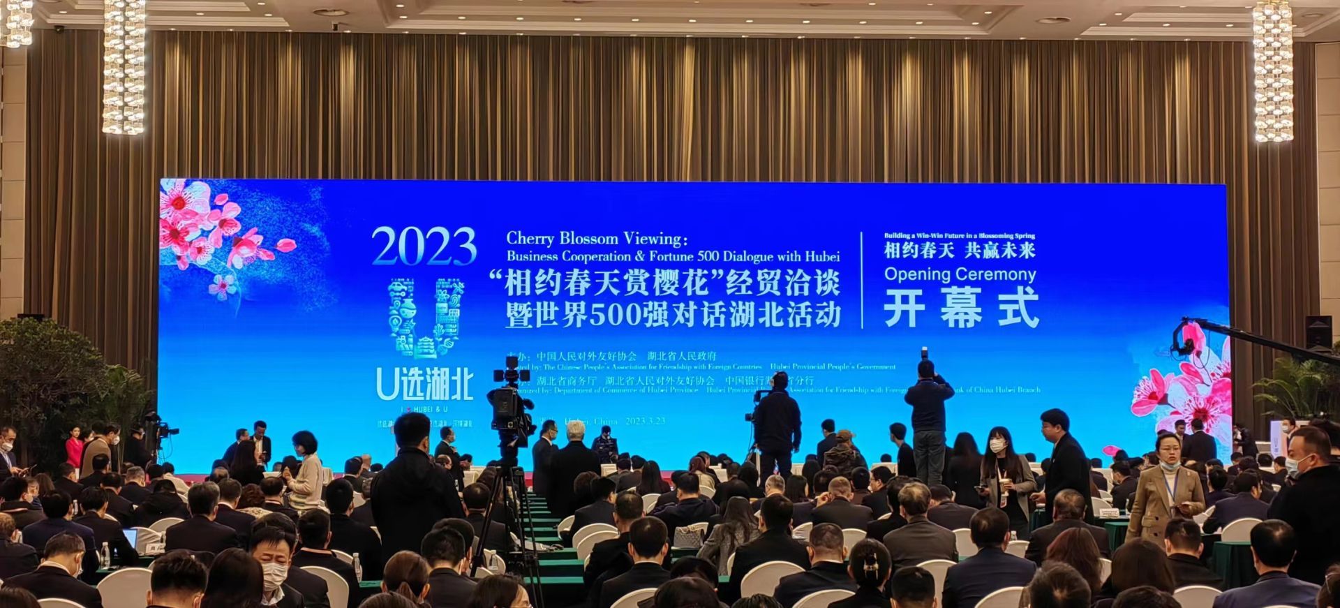 3月23日9:00,2023“相约春天赏樱花”经贸洽谈暨世界500强对话湖北活动在武汉东湖国际会议中心开幕。