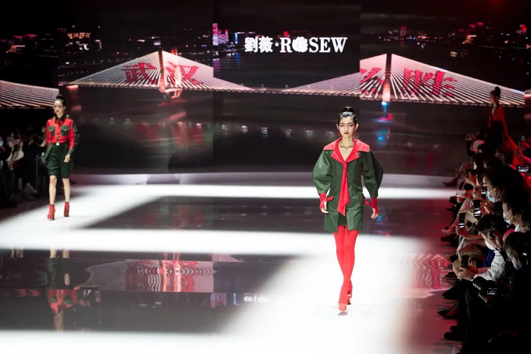 开幕秀舞台以热情奔放的中国红为灵感,揭示了武汉浴火重生,从艰难复苏到繁华再塑,在聚光灯下重启城市时尚流行文化。