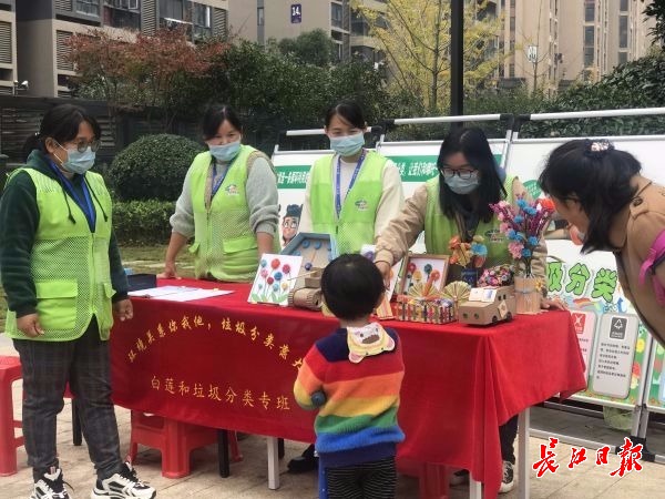当代国际城小区垃圾分类宣传台前,用废弃物制成的玩具,吸引小区孩子驻足。记者王慧纯 摄