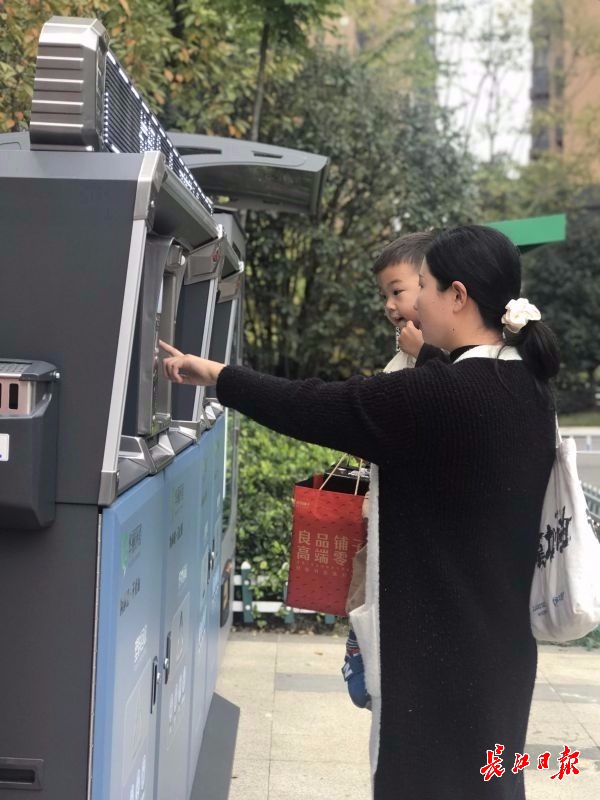 27日,长江日报-长江网记者走进谷尚居社区当代国际城小区看到,小区的智能垃圾分类箱就设在大门附近,不断有居民过来,在督导员的帮助下将纸袋、油壶等废弃物压实,分别放入标明“纸张”“塑料”的可回收物垃圾箱,电池和过期药品,则放进有害垃圾收集箱。垃圾箱边,有两台积分兑换机,居民可以用垃圾回收的分数,现场换取纸巾、垃圾袋等生活用品。