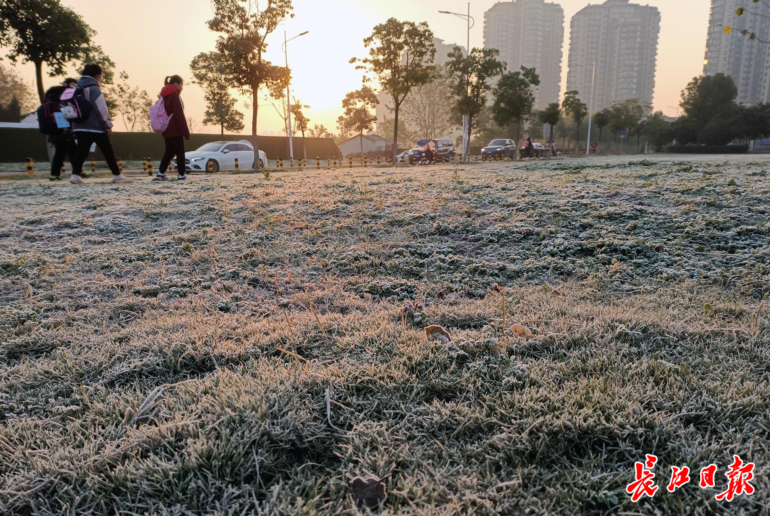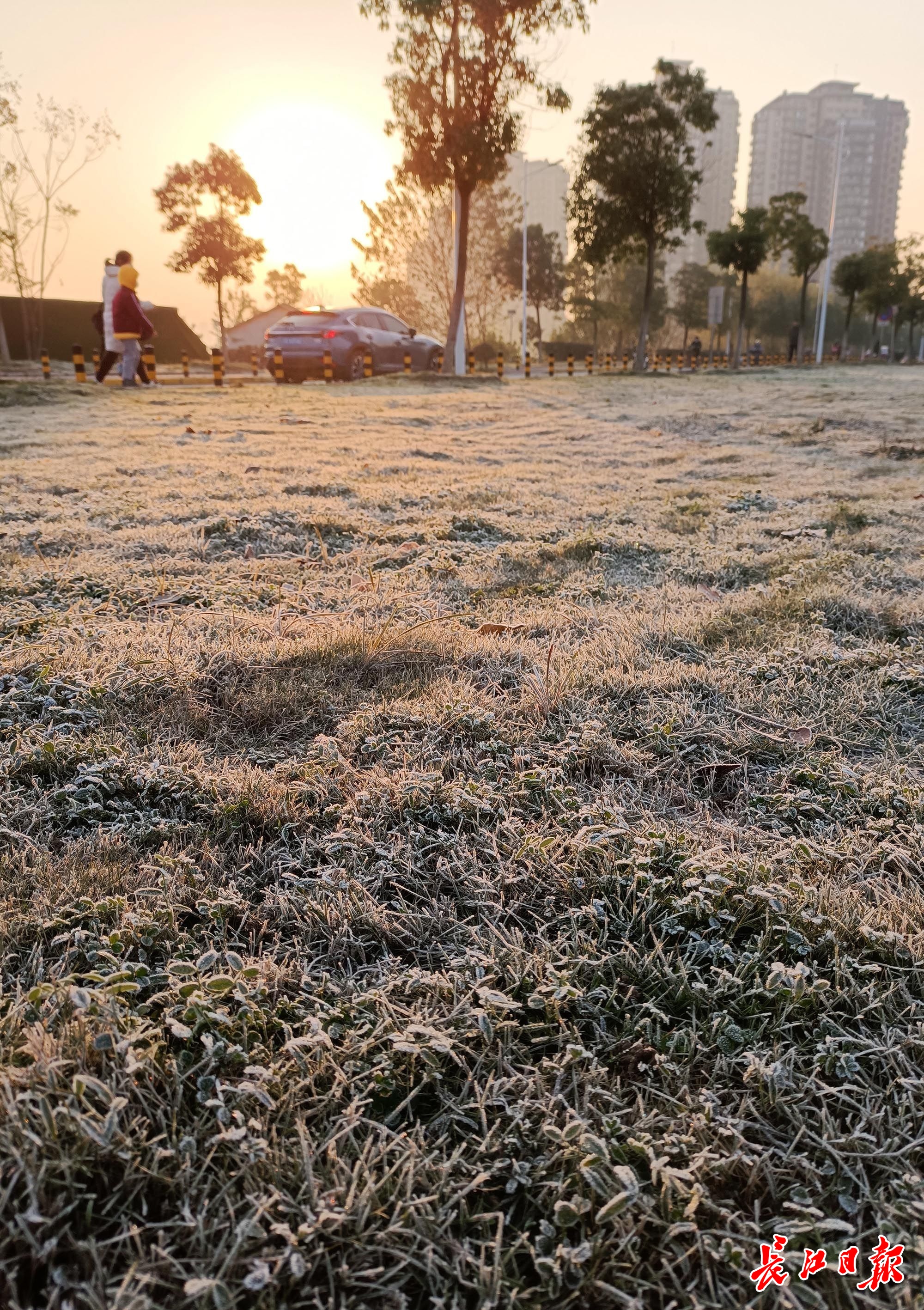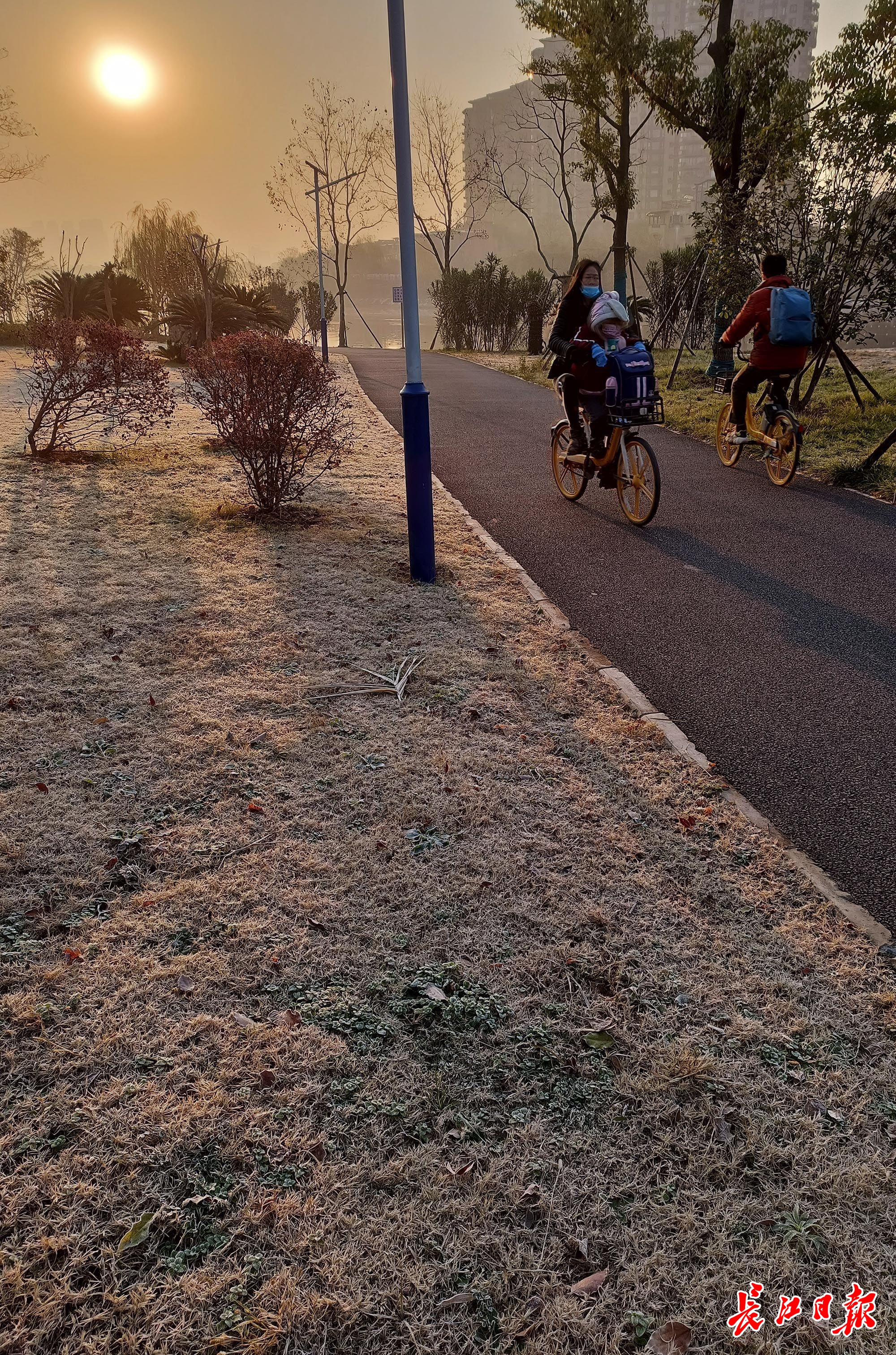 长江日报-长江网12月21日讯 12月21日,冬至。虽然太阳一早就洒下暖暖的阳光,但是天气依旧寒冷。金银湖绿道旁的草地上,覆盖着一层白霜,路边停放的车辆也被白霜冻结,远看如积雪一般,让不少上学路上的孩子兴奋不已。近两日天气放晴,但是早晚低温都在零度以下,空气中的水分便会凝结成霜。(记者李永刚 摄影报道)