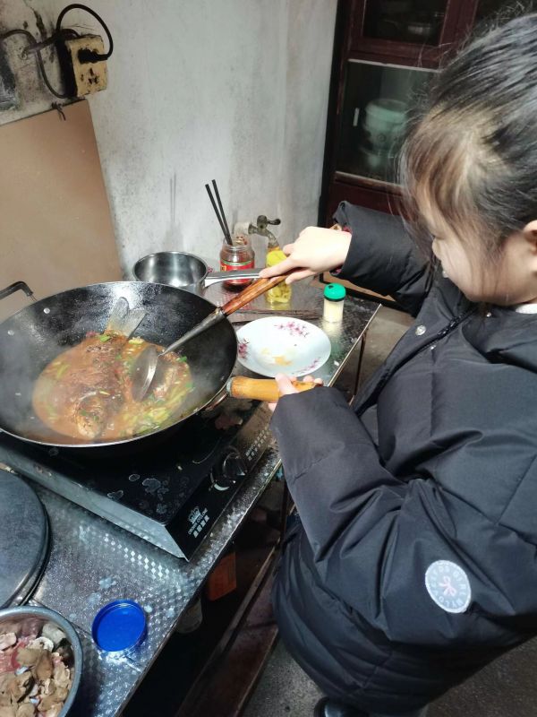 六2班伍瑾哲的妈妈说:“如今生活条件好了,选择在外吃年饭的家庭越来越多,但总像缺点什么,孩子更体会不到那种传统年的味道。学校布置这项作业非常有意义,虽然孩子的手艺比较粗笨,但和家人一起用心用情,就能制作出入味入心的佳肴。”