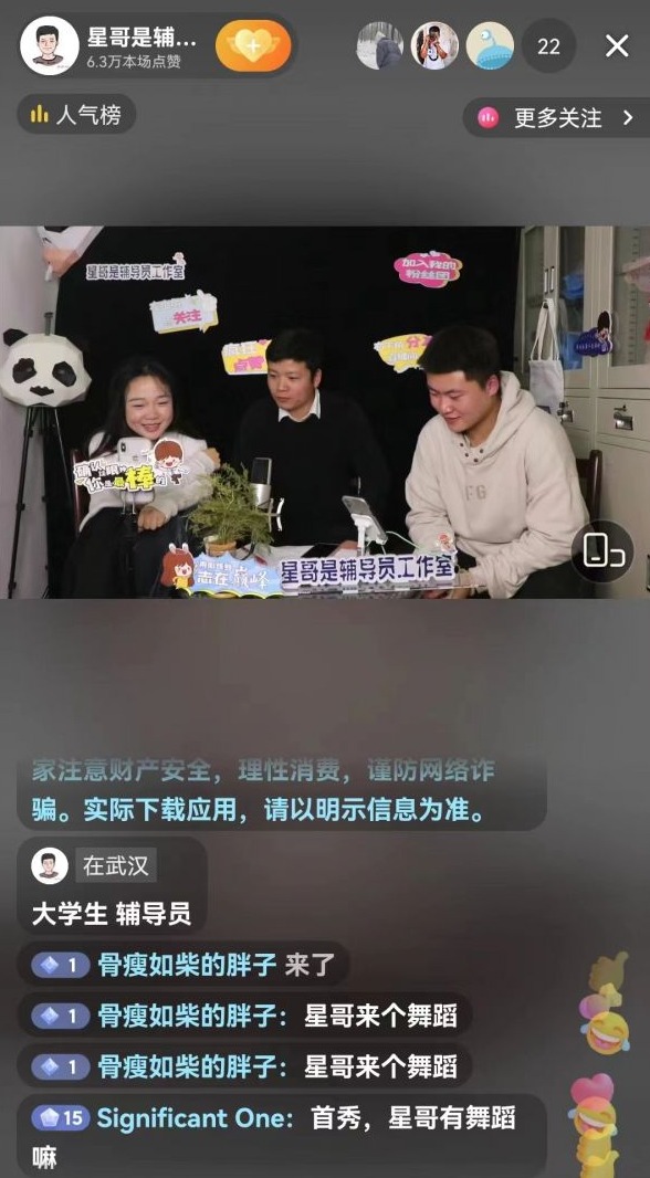 湖北大学知行学院人文学院的“星哥是辅导员”直播间。
