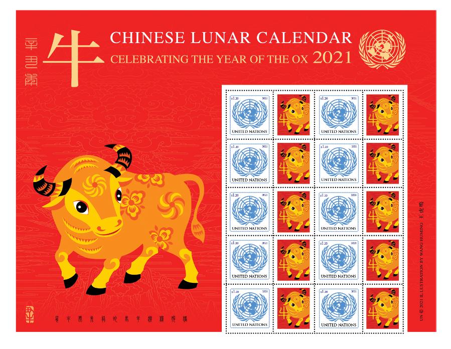 联合国邮政管理局将于1月22日在纽约发行中国农历辛丑年特别版邮票版张,以庆祝2021年中国农历新年。