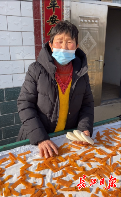 夏春珍家门前晾晒着自己做的萝卜干,她告诉记者,就在前几天,她请村干部帮忙给外地的儿子、女儿寄去了自己亲手做的萝卜干、糍粑和肉糕等家乡年货。“大儿子说今年他一家就在广西打工的地方过年,等疫情过去了再回家看我。我就给他们寄了一些年货,让他们在外地也能吃到老家的东西。虽然在市场上也能买,但是自家做的味道不一样。”夏春珍言语中充满思念之情。