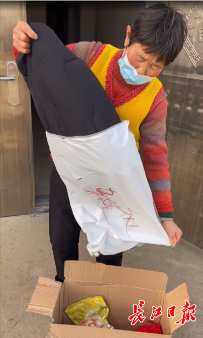 夏春珍是村里的留守独居老人,小儿子在武汉中心城区工作,大儿子一家长期在广西打工。她迫不及待地拆开纸箱,只见里面塞满了儿子置办的年货:棉衣、毛衣、棉鞋、瓜子、奶粉……吃的穿的应有尽有。