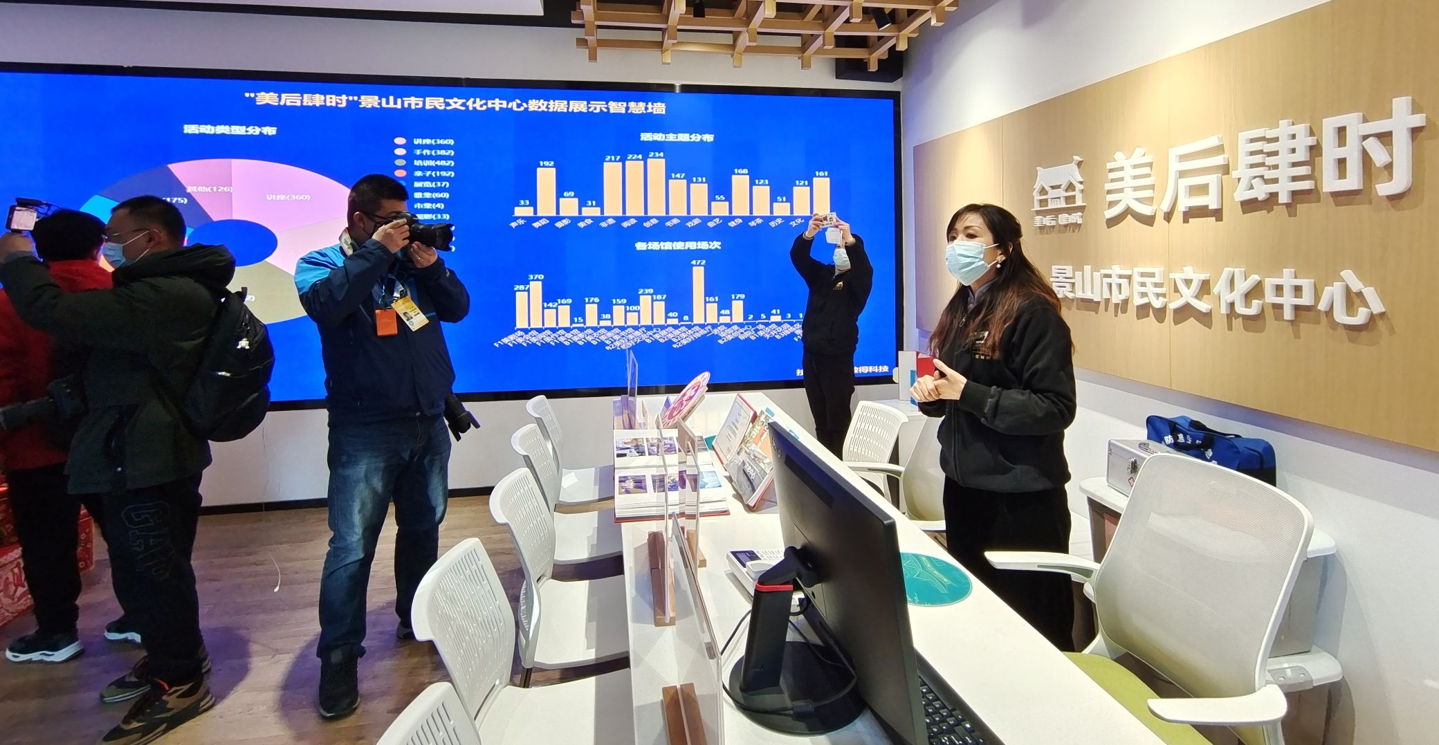 在美后肆时的接待室,一整面墙“智慧墙”精准地展示了该中心近期所举办的讲座、手作、培训、亲子等庆冬奥、迎新年系列活动的人员。