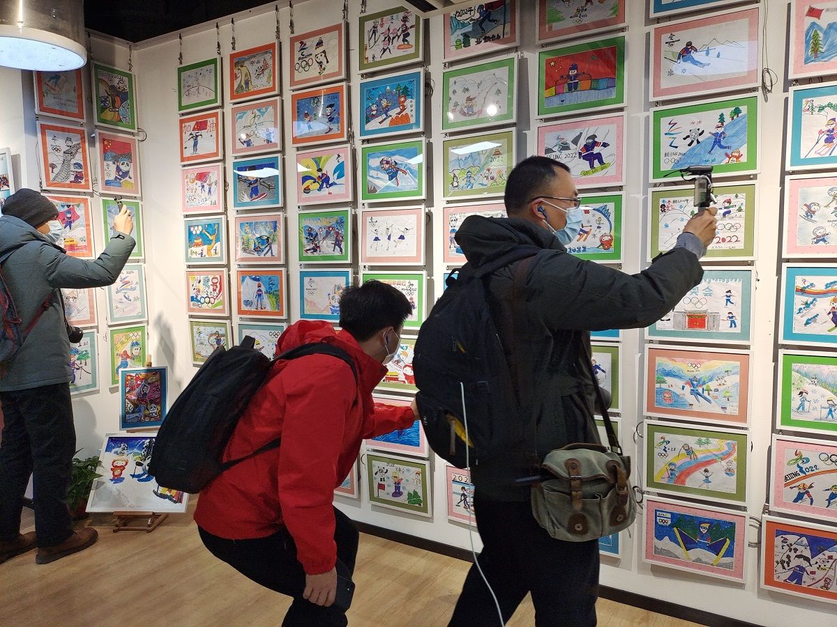 长江日报记者詹松(右一)直播孩子们迎冬奥的画作。长江日报记者柯立 摄