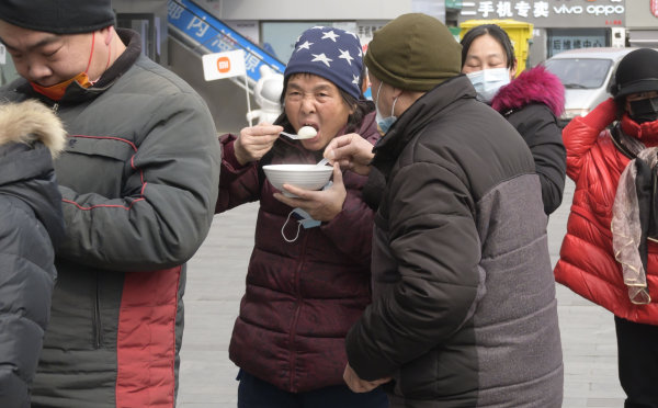 2月5日中午,在汉口五芳斋门前,许多市民排长队购买我市传统名小吃之一的汤圆,一位大爷爷端着一碗刚煮熟的汤圆从店里走出来,与正在外面排队准备买叠式汤圆的老伴一起分享。 长江日报记者金思柳 摄