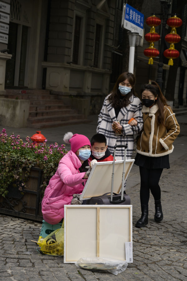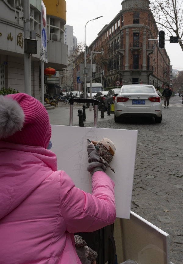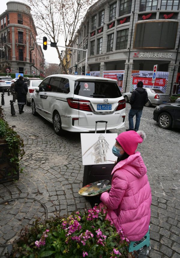 2月5日中午,在汉口黎黄陂路,一位湖北美院的美术老师以百年老建筑“巴公房子“为对象进行系列油画创作,历时5个多小时。 长江日报记者金思柳 摄