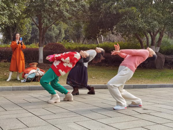 《到青山公园拍抖音》。2月5日下午2时许,在青山公园 ,几位有着舞蹈功底的市民在公园门口的假山前一遍遍挑战“青绿腰”,直到视频拍满意为止。 城市摄影队 陈泉 摄