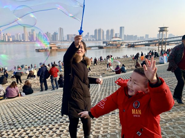 《追逐春天的阳光》 2月4日 ,汉口江滩公园 ,虎年初四,天空放晴。太阳给人带来暖暖的春意。阳光下,人们带着小孩或挖沙或放风筝玩耍。一个虎头虎脑的小男孩在追逐着泡泡,阳光下,泡泡上七彩斑澜。 城市摄影队 雨洒江天 摄