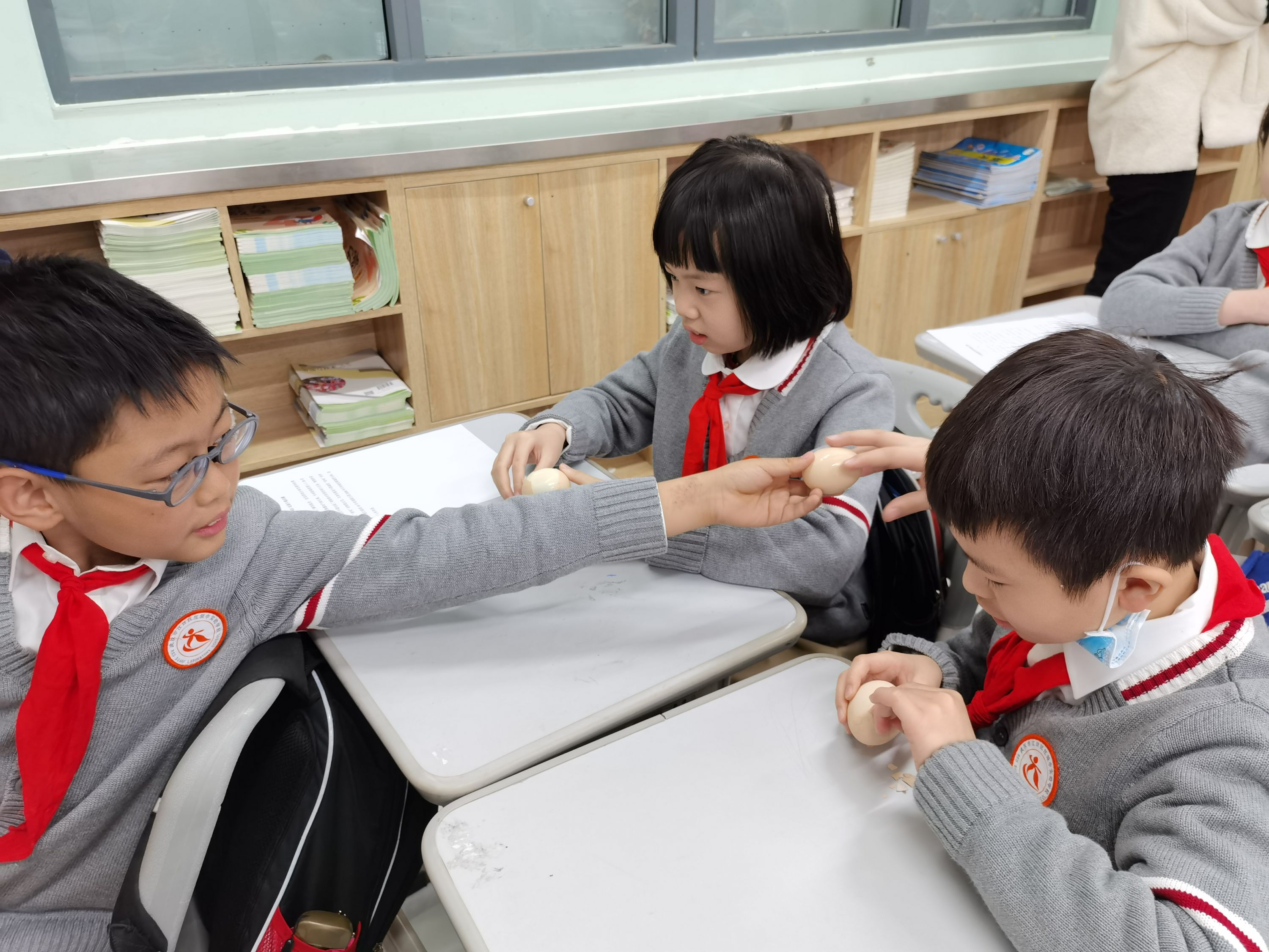这些转变是怎么来的呢?刘心悦把一盆鸡蛋抱进了教室,给每个学生发了一个,请大家品尝。小朋友们都兴奋起来,开心地吃起了鸡蛋。