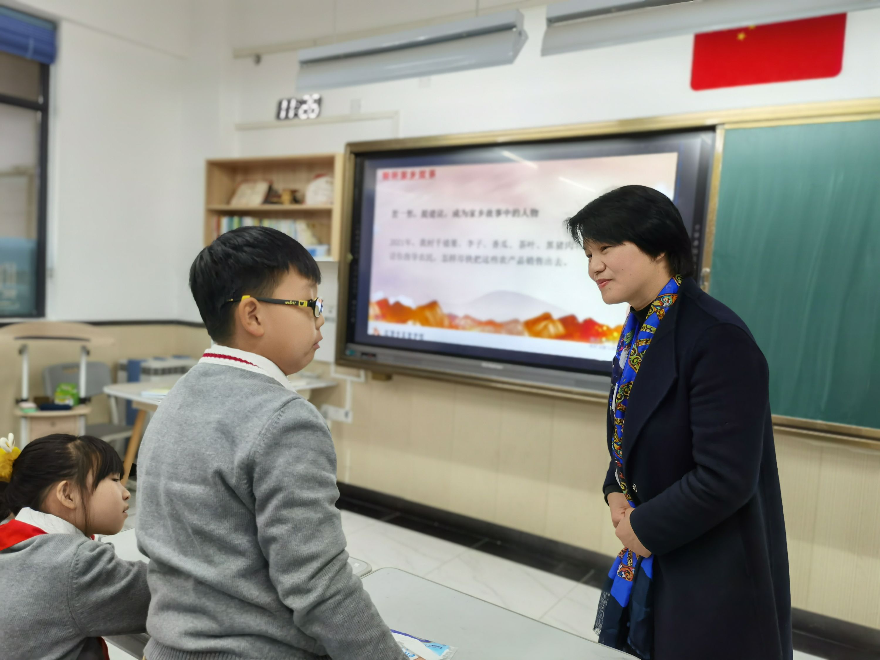 “这张照片里是我的奶奶,你们看,照片里她穿的衣服很旧。”这节课前,刘心悦请孩子们在家中收集了一些老照片。通过一张张老照片,孩子们“穿越”回长辈们过去生活的时空。学生陆遥感叹:“现在我们的衣服干净漂亮,楼房也高大雄伟,这些年,我们的生活发生了巨大的变化。”刘心悦还给大家展示了一组记者拍摄的贫困家庭近5年的照片。照片中,贫困户的生活一年比一年好,笑容也越来越多。