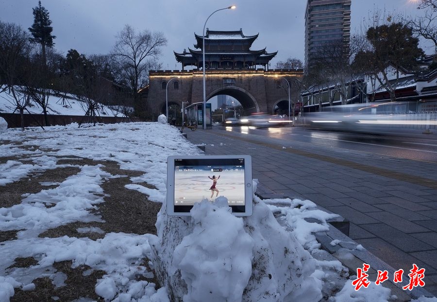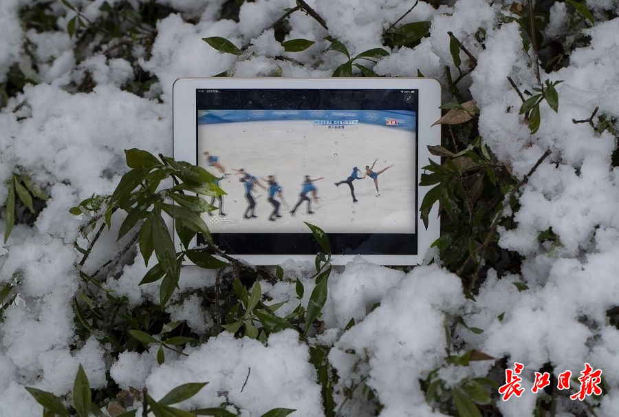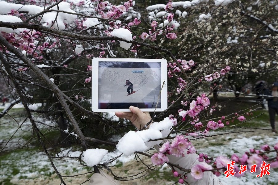 长江日报大武汉客户端2月8日讯 2022年2月7日,农历正月初七,武汉市飘起了虎年第一场大雪。记者携带正在播放北京冬奥会当日比赛项目的平板电脑,在黄鹤楼、东湖梅园、大禹神话园、铁门关等景点的雪景里展示比赛画面。(长江日报记者邱焰 摄影报道)
