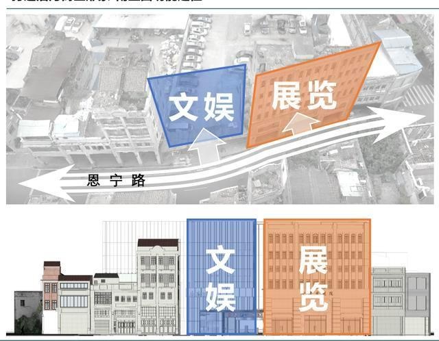 改造将对金声电影院首、二层进行主题策划,布置展览、图书阅览、放映等功能,续写电影回忆;地块面向金声广场一侧是建筑最重要的界面之一,在此植入表演、文创等功能组团,与广场空间产生互动;地块面向恩宁路一侧是建筑最重要的界面之一,在金声电影院保留骑楼立面位置植入展览功能;再已拆除的快捷酒店立面位置植入文娱功能,并缝合左右两侧沿街界面。“粤剧博物馆-粤博广场”与“金声片区(含金声电影院及周边建筑)-金声广场”,作为起始端点,一东一西,将形成片区主要建筑和公共空间。