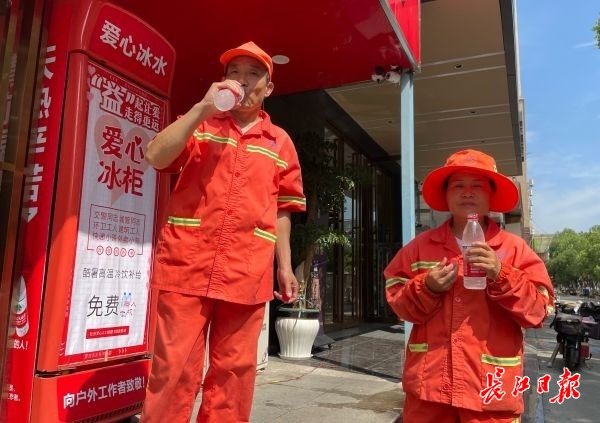彭华年拿了一瓶水,爽快地喝了一大口。“我们平时上班会带水,有时水喝完了,渴得不行了,才会过来拿一瓶。”他说,这里的老板和老板娘人非常好,天热时,经常会招呼他们喝水歇一下。“我们很感动,除了喝水方便,更感受到来自社会各界对环卫工人的关心,这种暖心问候也缓解了我们的工作压力。”