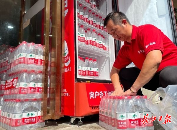 农夫山泉为爱心冰柜送水。记者刘斌 摄