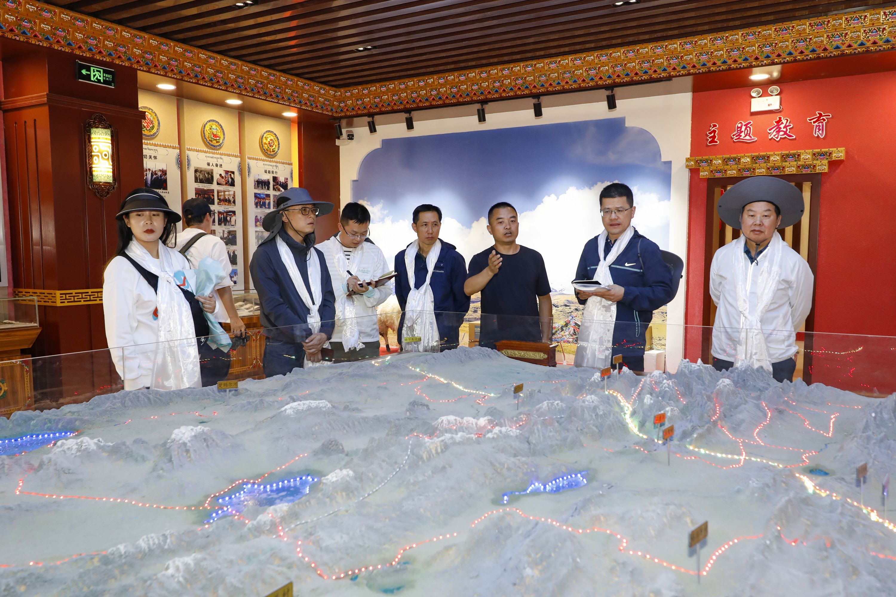 2023年7月22日,长江源村驻村第一书记李志斌(右三)在村史馆内,向“沿着长江读懂中国——万里长江行”探访团一行介绍长江源村的产业发展情况。探访团成员王筝 摄