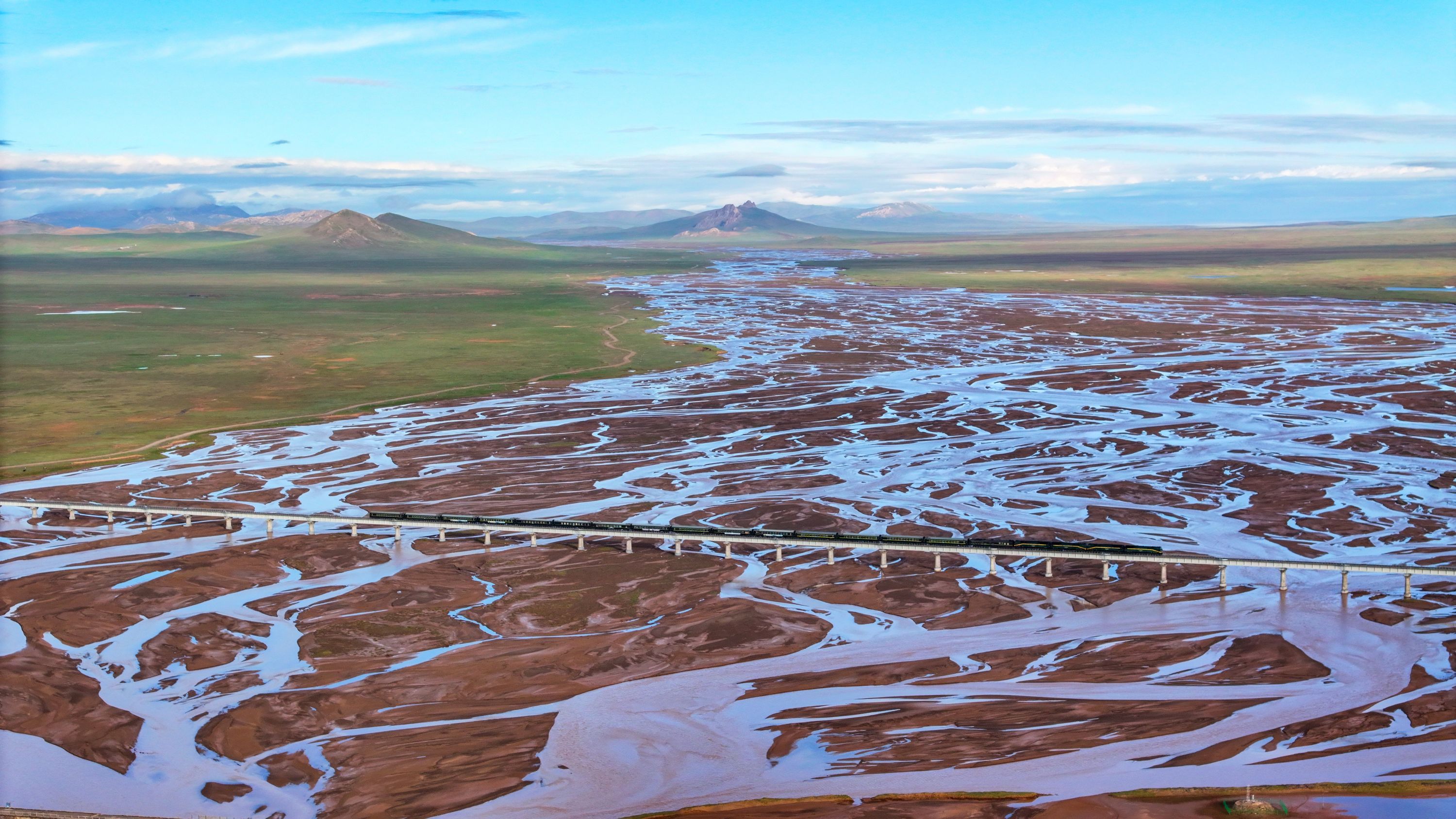 2023年7月23日,“沿着长江读懂中国——万里长江行”探访团来到长江源。这是用无人机航拍的长江源特大桥。探访团成员王筝 摄
