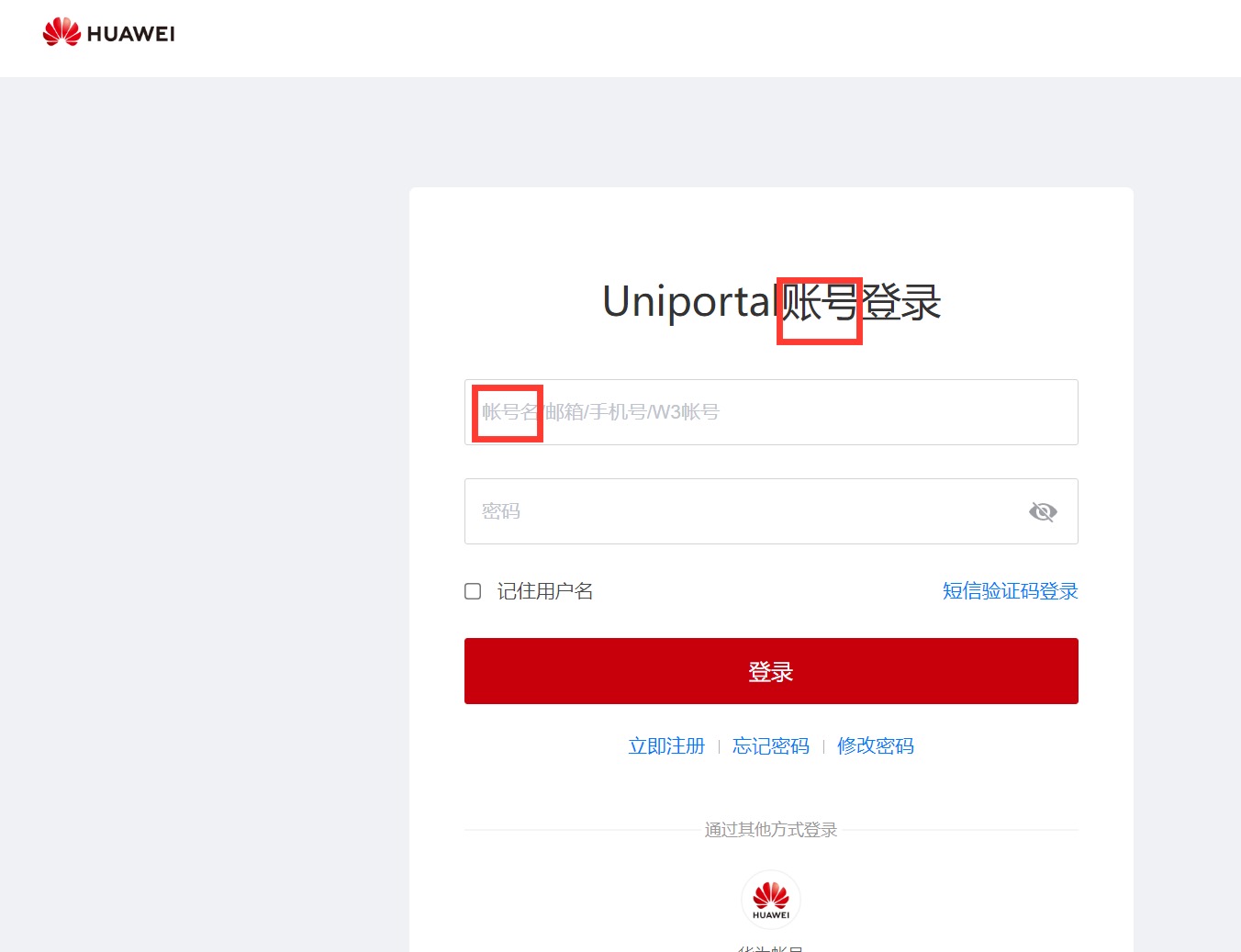 华为账号登录系统也存在“账号”和“帐号”混用情况。例如,在华为登录页面,“Uniprotal账号登录”使用了正确用法,但在页面下方,又同时出现了“帐号”“W3帐号”等错误用法。