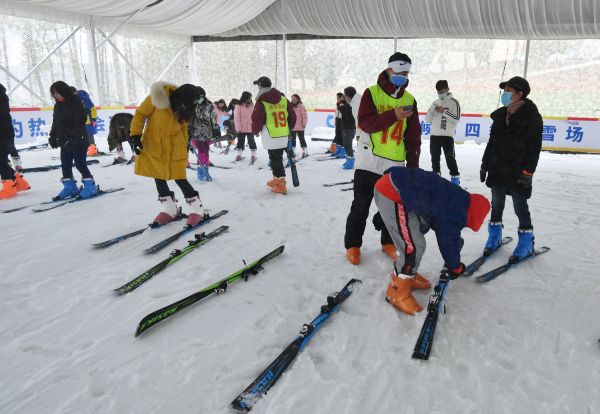 在雪场坡顶的滑雪道出发点,两名教练带领大家先进行热身,并为没有滑雪经验的市民讲解上板、站立、刹车、滑行及转弯的正确操作方法,“前脚掌先卡住雪板前端,后脚掌用力蹬进去就可以了”“站立呈内八字型,前脚掌中间距离为一至2个拳头宽,角度越大,速度越慢,更容易刹车,反之,两脚越平行,滑行速度越快”……