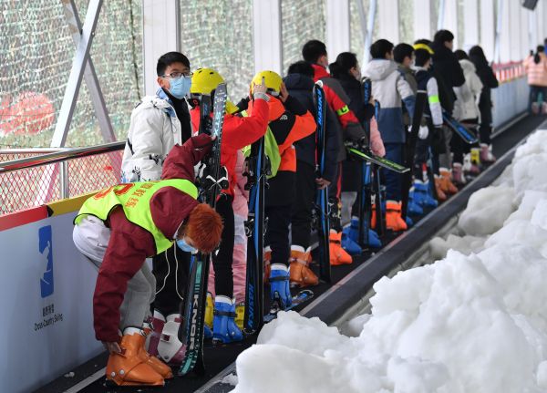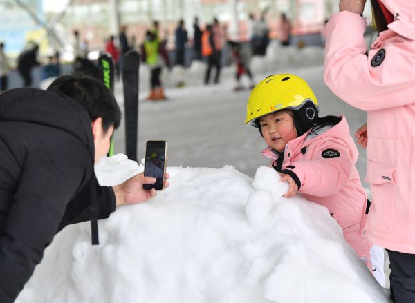 在工作人员的带领下,大家扫码测量体温,随后进入四季滑雪场。换好雪靴,手持雪板,来自汉口的小高和他的小伙伴一进场看甩开了身后的爸爸妈妈,直奔魔毯传输道。“这个雪场不小啊,感觉置身冰天雪地,真漂亮。”