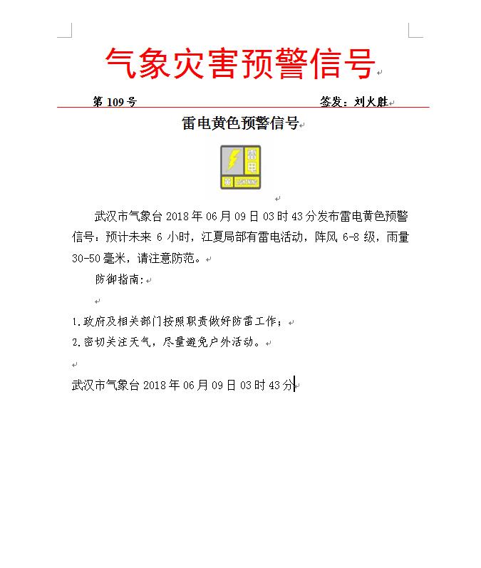 武汉市气象台发布雷电黄色预警信号