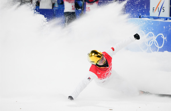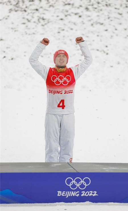 2月16日,中国选手齐广璞完成动作后庆祝。 新华社发