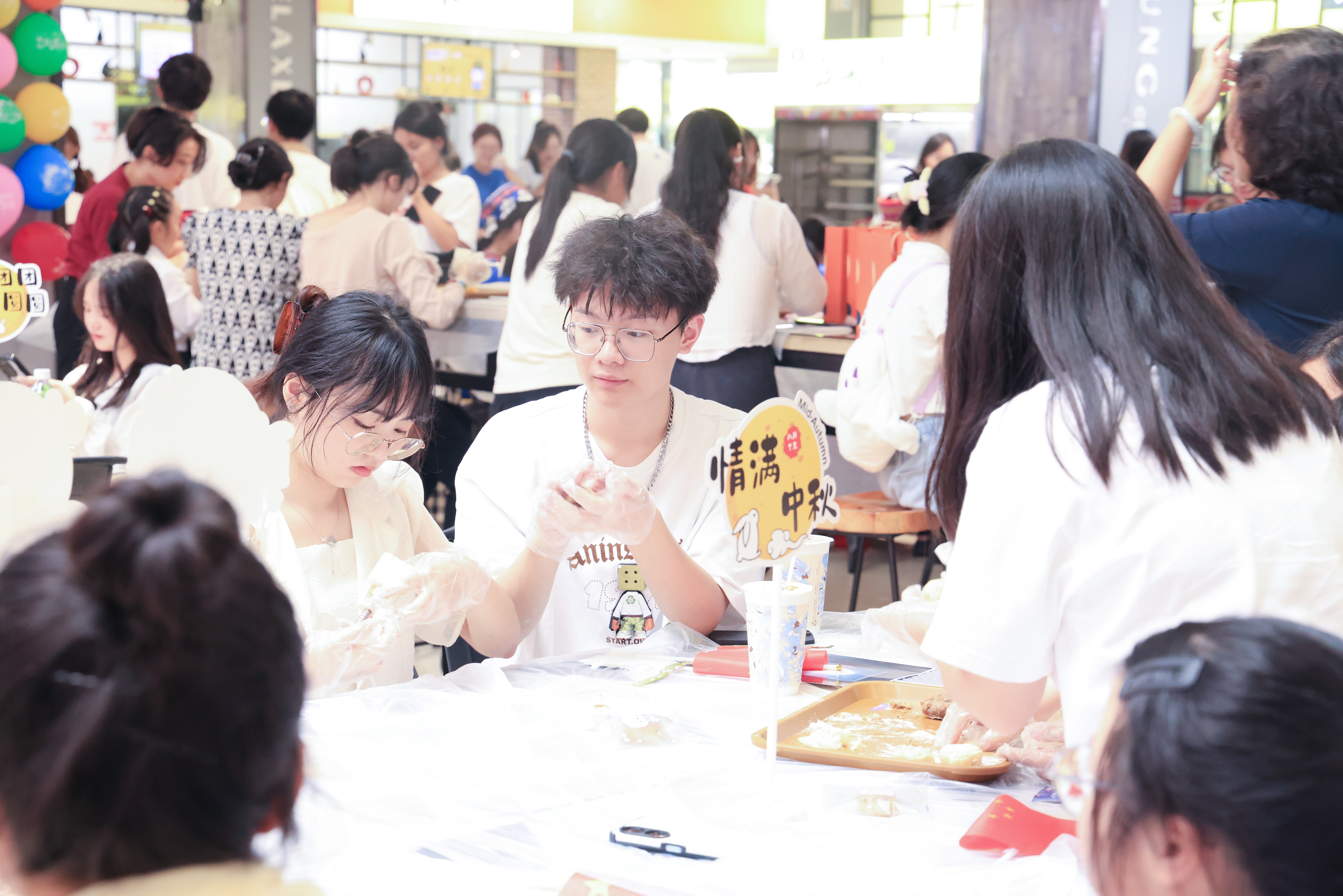 一边包月饼一边欣赏民族歌舞,150余名不同民族师生共度中秋。