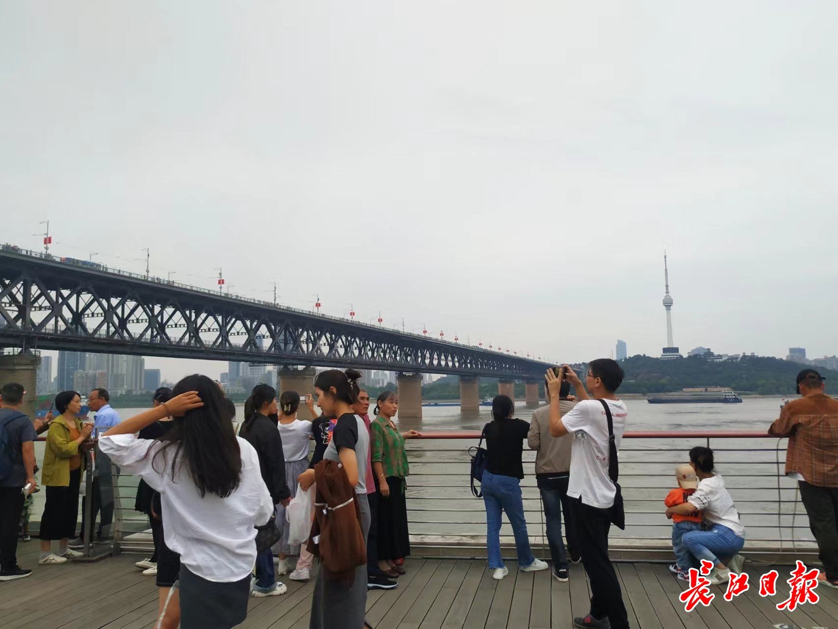 游客在中华路城市阳台观江赏景、拍照。记者程佳怡 摄