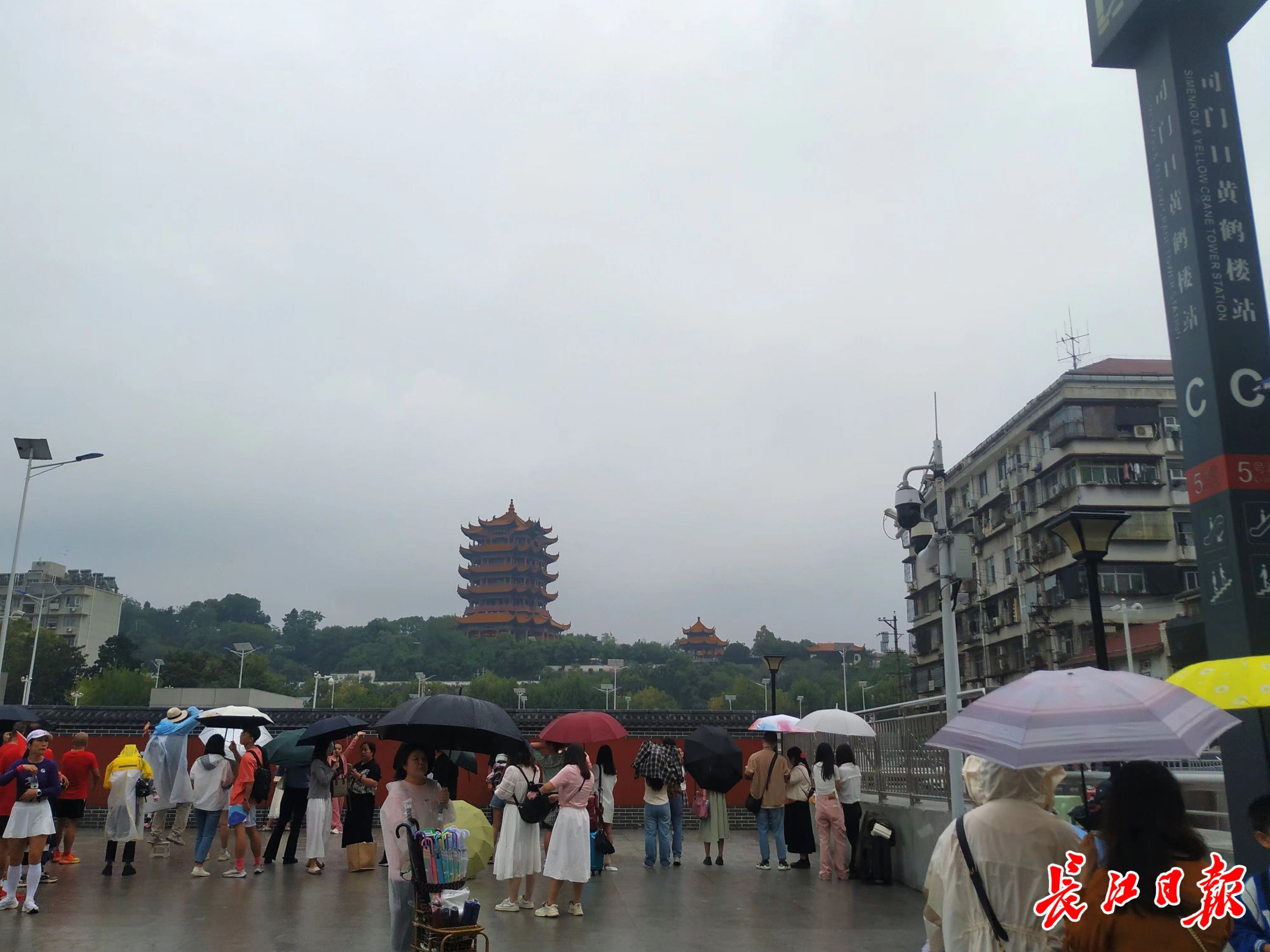 游客冒雨打卡司门口黄鹤楼站C出口旁的红墙。记者程佳怡 摄