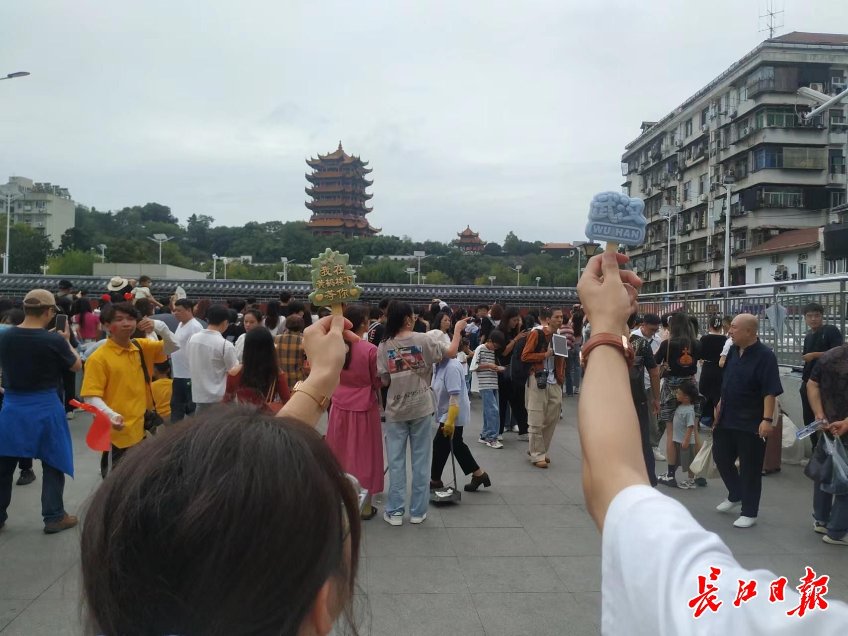 从陕西来的大学生袁同学和姐姐们拿着黄鹤楼文创产品和古风扇子,轮相拍照。“进不去黄鹤楼,在这里打卡拍照一样的,角度很独特”,袁先生说。