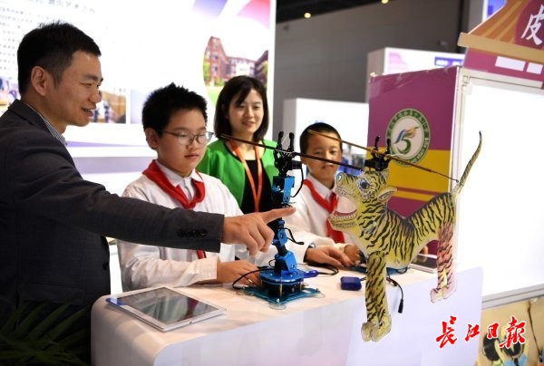 光谷第十五小学学生在表演智能皮影戏,学生通过平板操控机械臂带动皮影运动。记者高勇 摄