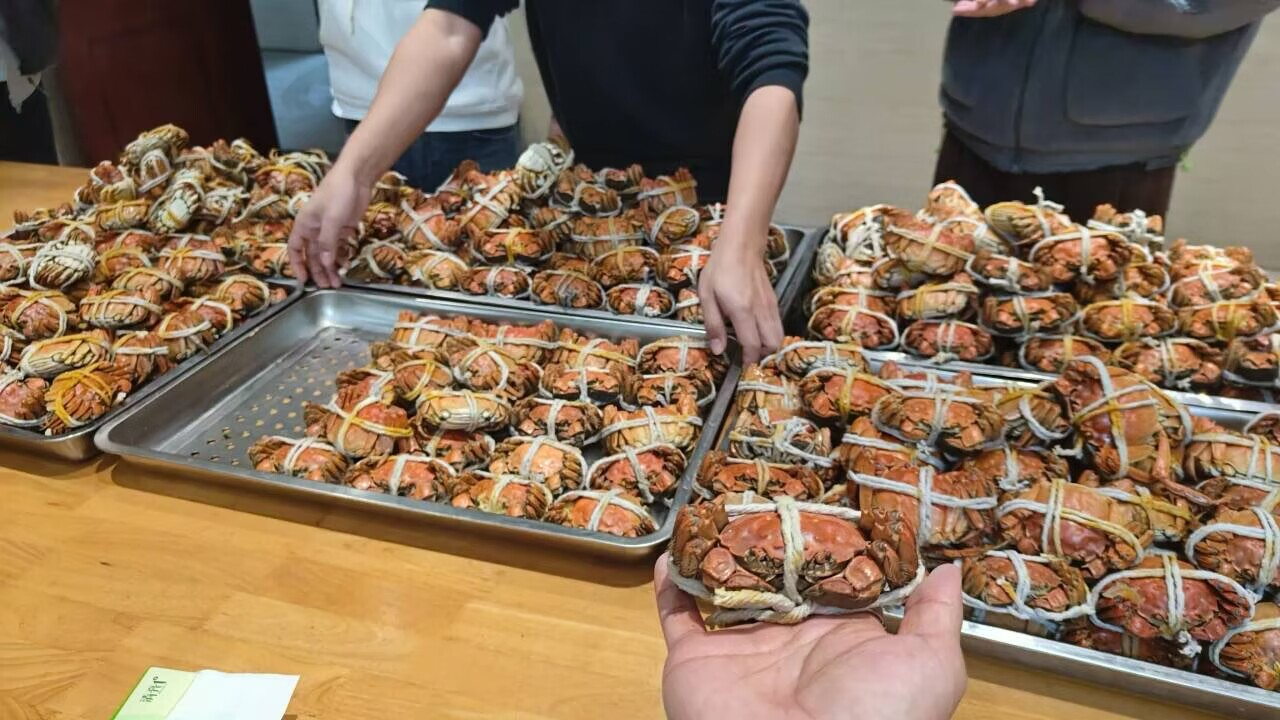 大闸蟹由学校集中加工处理,师生拆绳即可食用。