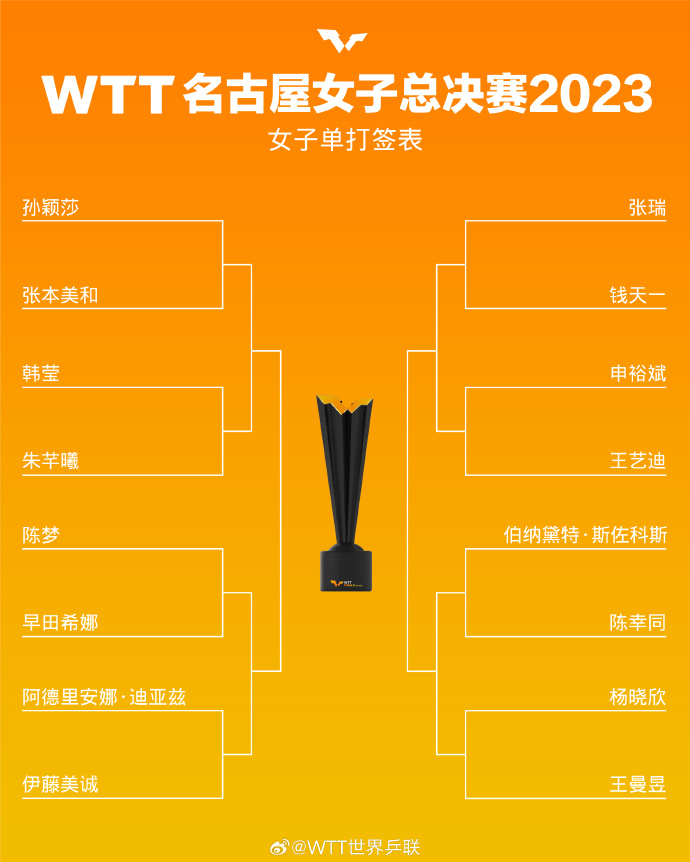2023世界乒联名古屋女子总决赛开赛在即,对阵图今日出炉。