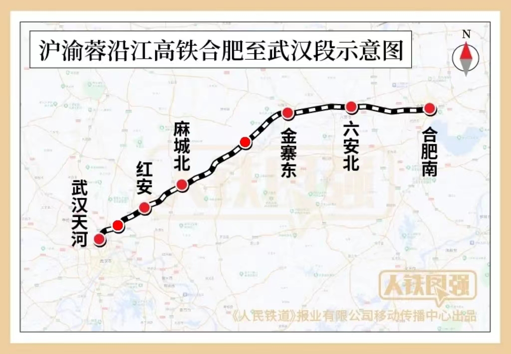 沿江高铁合武段位于安徽、湖北省境内,线路起自合肥铁路枢纽合肥南站,经安徽省六安市区及金寨县,湖北省麻城市、红安县至武汉铁路枢纽,经武汉天河站接入在建的沪渝蓉沿江高铁武汉至宜昌段。线路全长约360公里,设计时速350公里,共设合肥南等8座车站,建设工期4.5年。