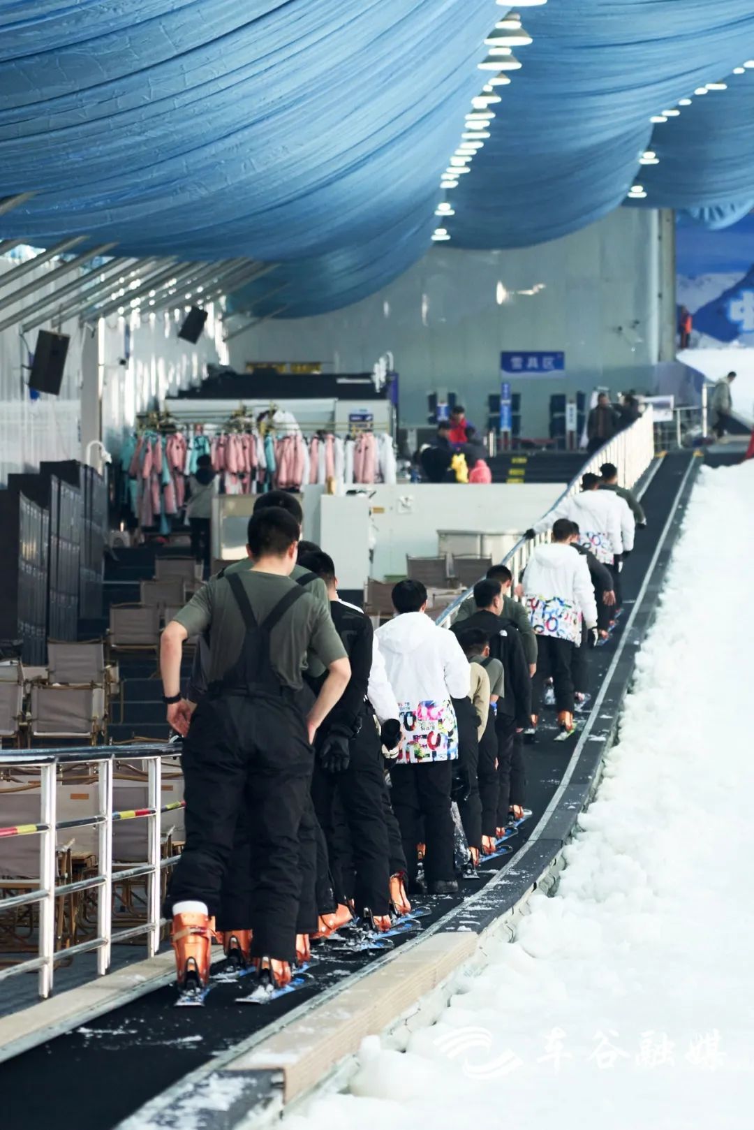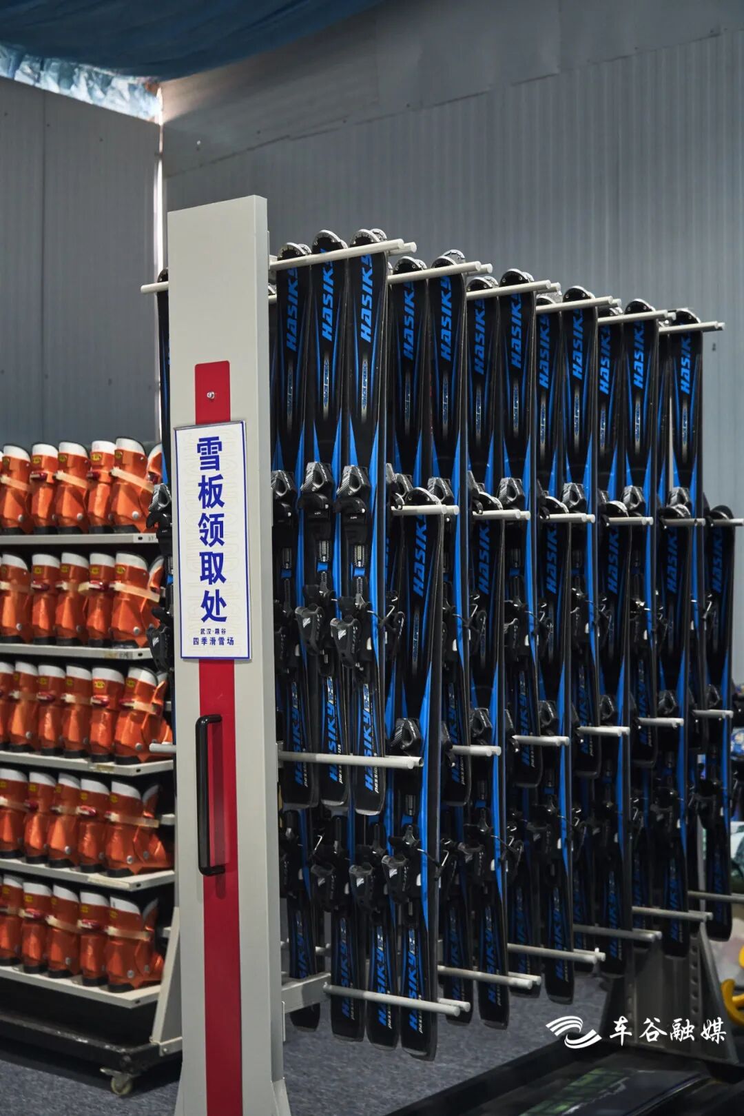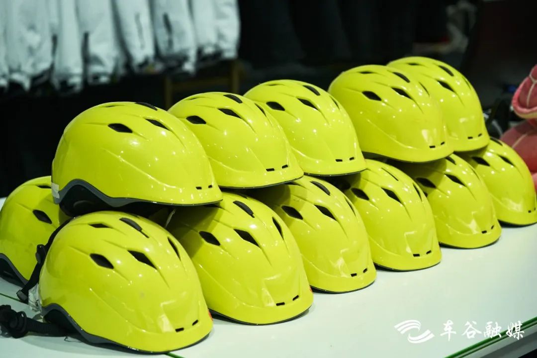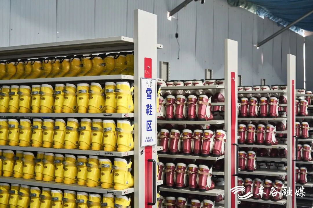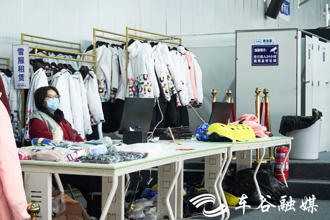 左手边就是装备区啦,负责雪板的发放回收,头盔、滑雪服、护具护臀护膝一应俱全。工作人员在旁边随时待命,有任何问题可以向他们寻求帮助。