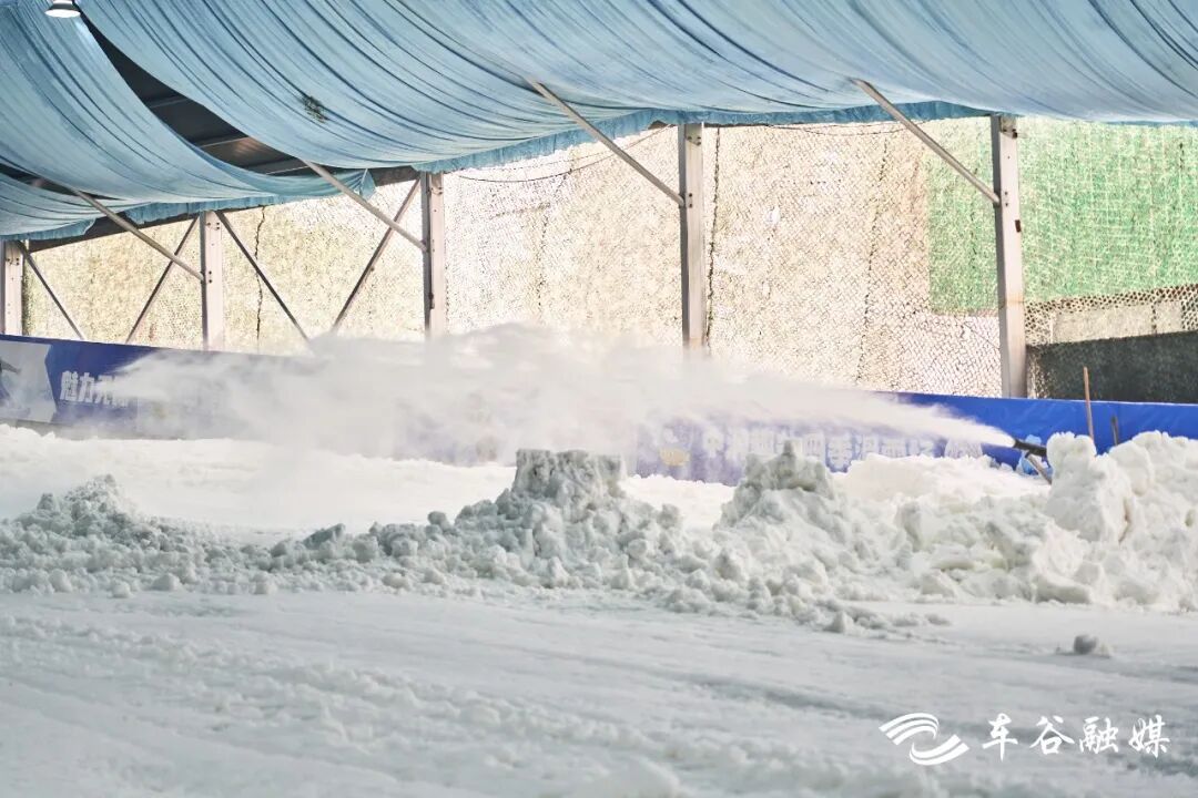 雪都是由人工造雪机现场制造。冰雪从造雪机的两个管道里不断喷射出来,达到一定体积后,由专业的轧雪机压实铺平,形成一条条雪道。雪道完成后,造雪机将持续工作以保证滑雪效果。