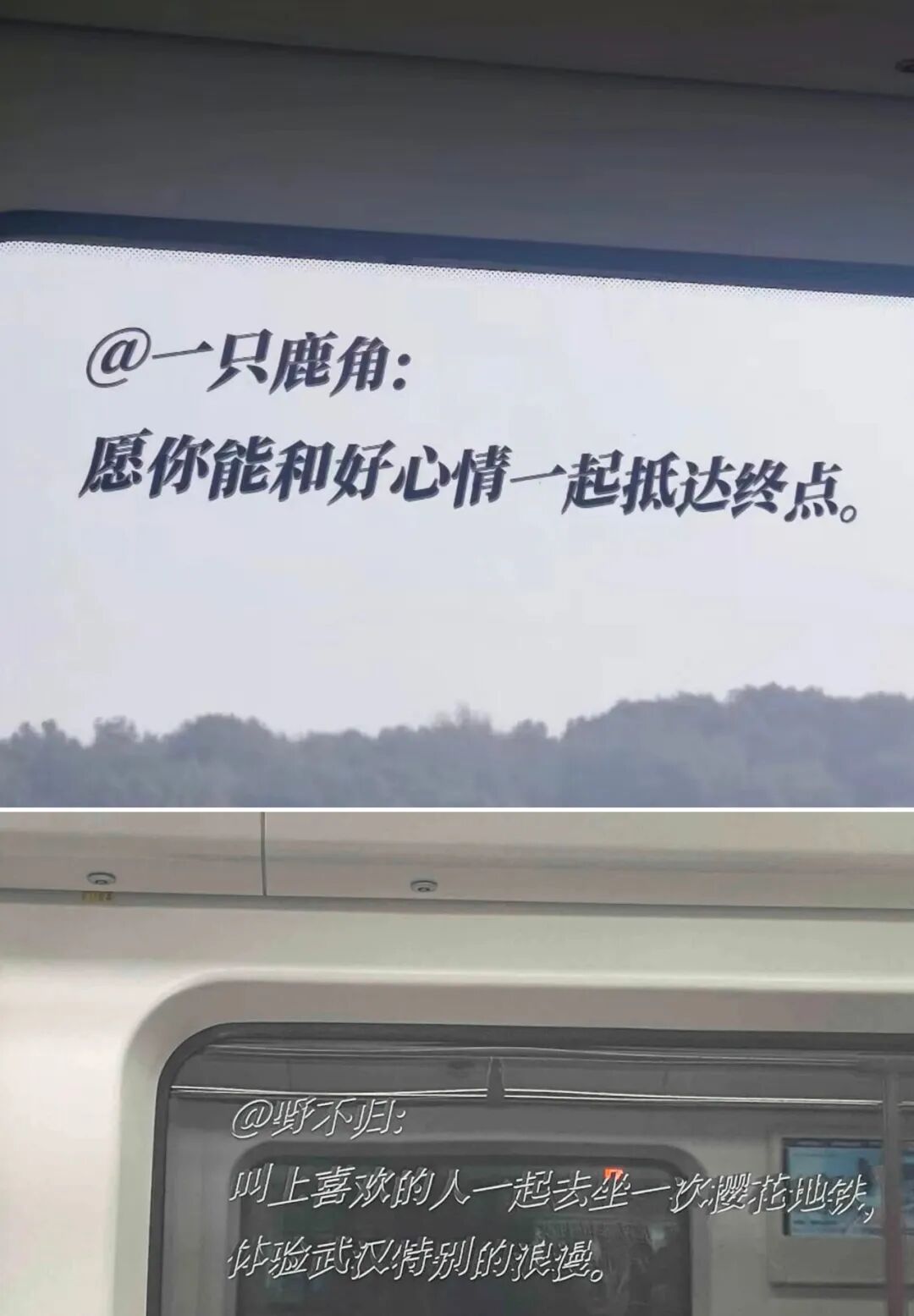 看到地铁车窗上的“愿你能和好心情一起抵达终点”,不由得回想自己当时给武汉地铁写下这句话的心情。每次乘坐地铁上班,我都能感受到元气满满的一天正在开启。虽然地铁上每个人的目的地不同,但是朝着美好生活前进的愿望肯定是一致的,因此也希望所有人能够和好心情一起抵达终点。
