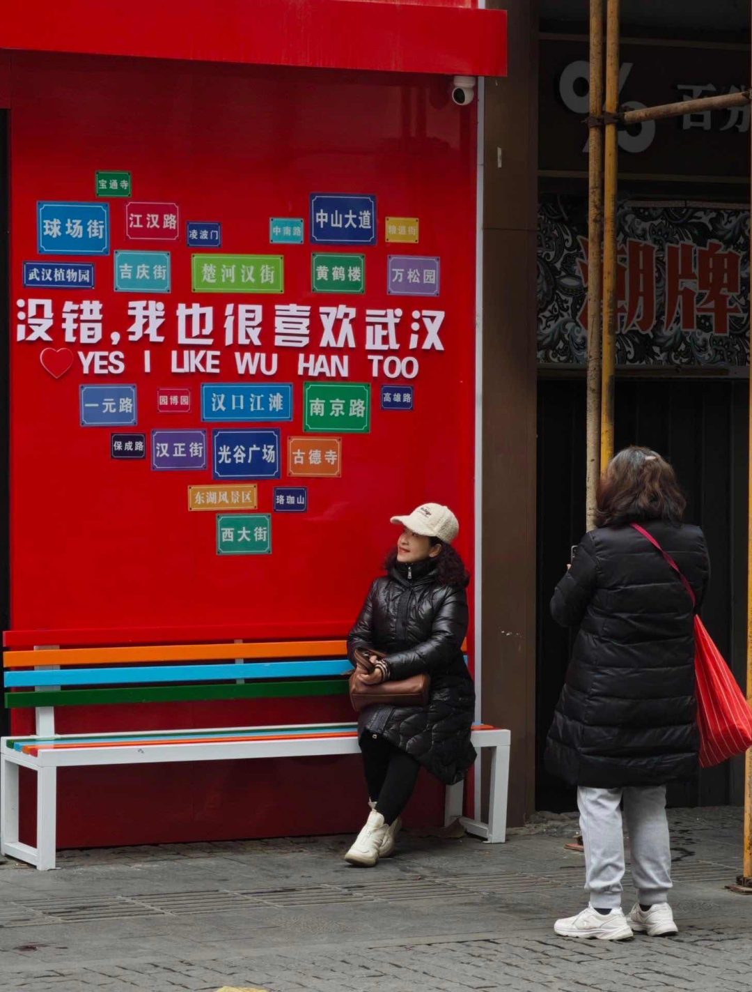 现在武汉的大街小巷都有很多活泼可爱的打卡点,这块由武汉知名景点和路牌组成的爱心红墙就吸引了很多人驻足拍照。摄于中山大道。