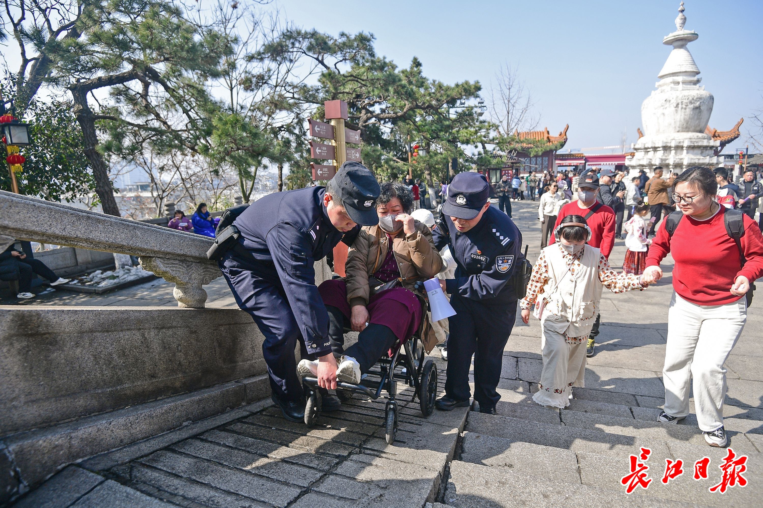 长江日报大武汉客户端2月12日讯(记者戴旻阳 通讯员孙逊)暖阳高照,冰雪消融。2月11日大年初二上午,黄鹤楼景区内游人如织。手持楼宇造型雪糕拍照,登楼一览城市美景,游人欢声笑语间,民警忙碌不停。武昌区公安分局黄鹤楼派出所的民警前脚刚帮游客找到走失的男孩,后脚又为行动不便的游客推轮椅。白云黄鹤的美景里,总有他们的默默守护。